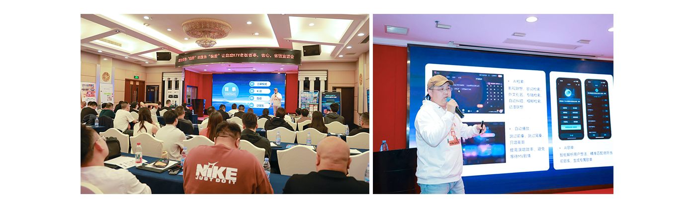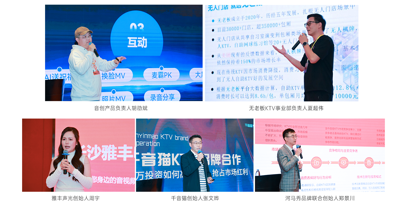 音创凭借自身在智能娱乐体验领域的深厚技术积累和丰富实践经验,与合作伙伴,行业从业者等展开深入交流。音创产品负责人胡劭斌登台分享了音创最新的“自助KTV软硬件解决方案”。其中,音创硬件产品的“三屏异显”和“副屏同显”,软件产品的“K歌”“趣味互动”和“AI应用”等丰富功能,为自助KTV商家提供搭建方便、运营省心、功能丰富的自助KTV整体解决方案。