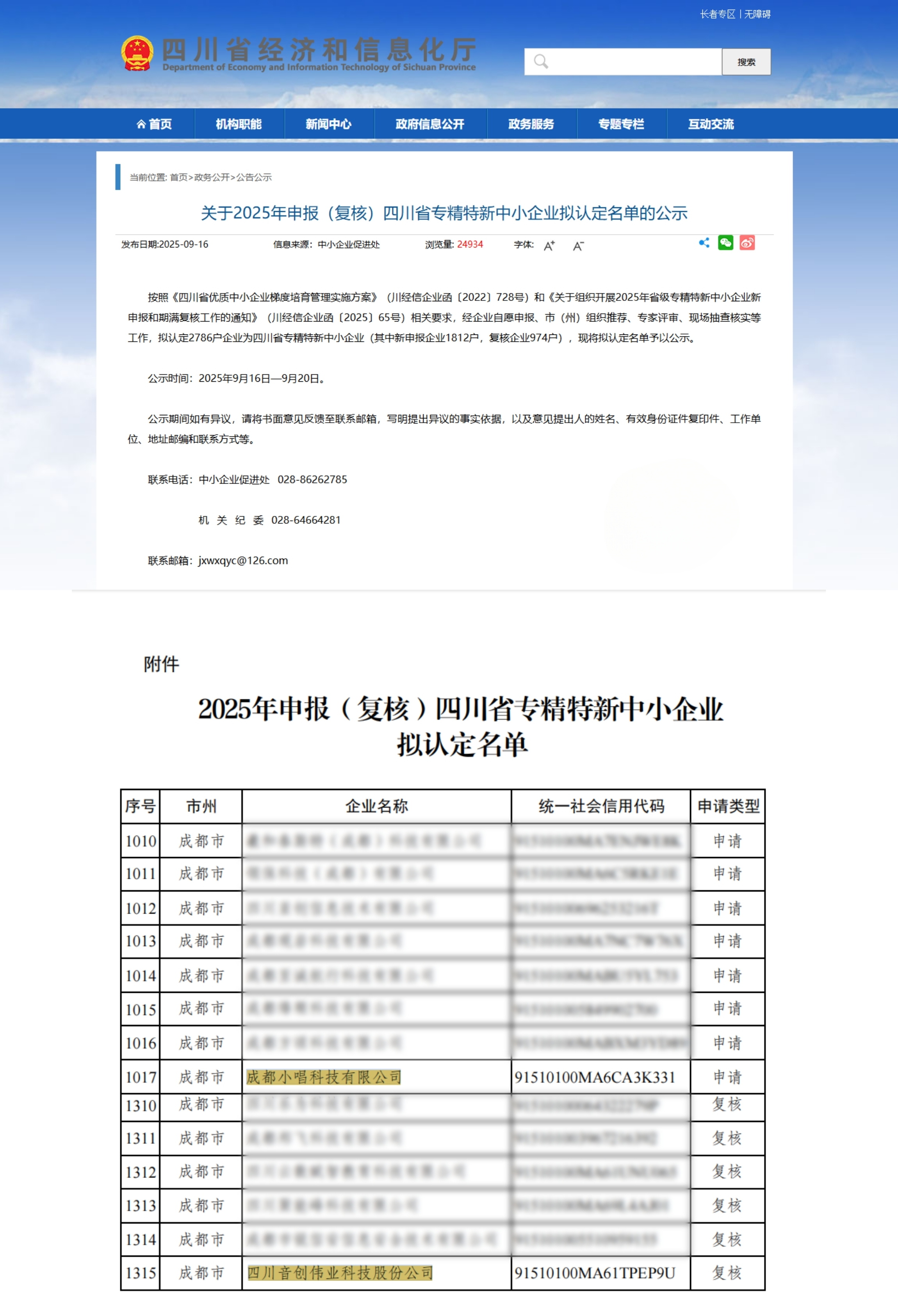 近日,四川省经济和信息化厅按照《四川省优质中小企业梯度培育管理实施方案》和《关于组织开展2025年省级专精特新中小企业新申报和期满复核工作的通知》相关要求,经企业自愿申报、市(州)组织推荐、专家评审、现场抽查核实等工作,于9月20日公示结束,再次认定四川音创伟业科技股份公司,首次认定其全资子公司成都小唱科技有限公司为四川省专精特新中小企业。