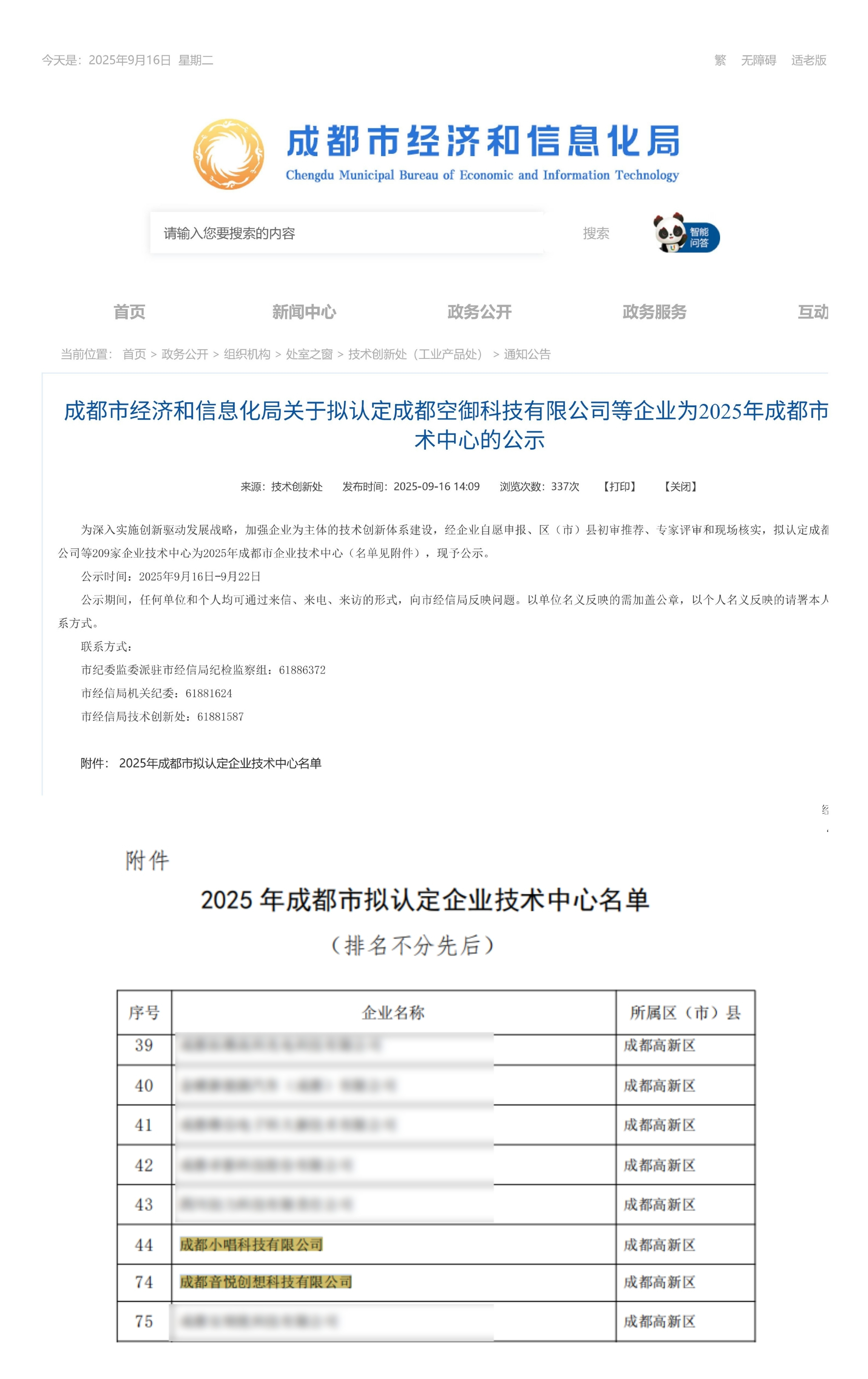 成都经信局公示“2025年成都市企业技术中心拟认定名单”,共209家企业入选名单。9月22日公示结束,音创全资子公司成都小唱科技有限公司、成都音悦创想科技有限公司顺利入选。